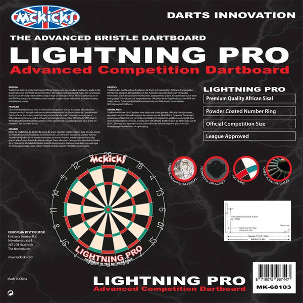 Het McKicks Lightning Pro dartbord is een superfijn dartbord met professioneel ingelegd (messen)draad. Dit mooie professionele instapmodel dartbord is perfect voor horeca en thuisgebruik. Het bord wordt geleverd met een geavanceerd ophangsysteem Rotate Fix Bracket.